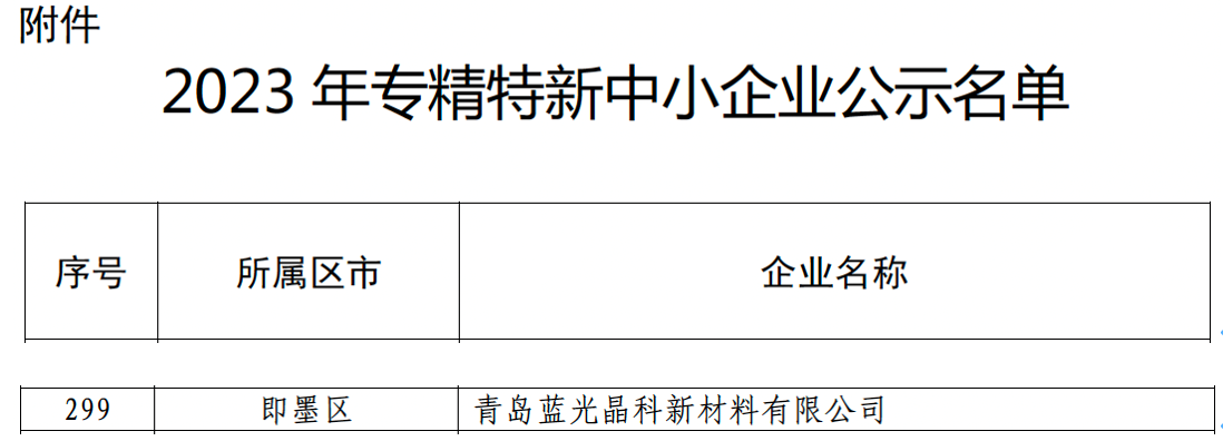 昨日,青岛市民营经济发展局公示了2023年专精特新中小企业名单,大工(青岛)研究院孵化公司青岛蓝光晶科新材料有限公司获得认定。此外,蓝光晶科副总经理陈良杰也荣获青岛市“未来之星”新锐人才托举计划。